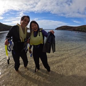 Dan and Chieko were great hosts and guides. Dan picked us up and we talked with him quite a bit. He was kind, knowledgeable, and down-to-earth. Chieko was energetic, caring, and knowledgeable. The whole process (pick up and drop off, fitting for flippers, trolley down to the beach, putting on wet suits (additional option), instructions on technique and guidelines, storage of valuables, etc) was smooth from start to finish. This was my partner’s first experience snorkeling; she felt safe and at ease with Dan’s and Chieko’s instructions and guidance. We spent some time in the shallows and then went to deeper parts of the bay. We saw lots of fish! Hanauma Bay is a very special place. Overall, this was an amazing experience that my partner and I highly recommend!!!