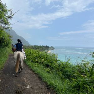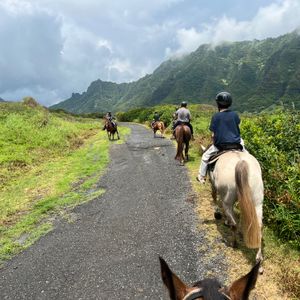 ハワイで乗馬したいと思い、こちらを申し込みました。2時間の乗馬コースです。実は、10年以上前まで乗馬クラブに通っていたのですが、駆け足がこわまなって辞めてしまった経験があります。今回は、馬に乗って大自然の中をゆっくり歩くだけなので、まったく怖くなく、久しぶりの乗馬を堪能できました。そもそも馬に乗るのが数年ぶり(北海道で何年か前にのっこたとがある)でしたので、最初はちょっと感覚を取り戻すのに時間がかかりましたが、途中から感覚を思い出し、それからは景色を堪能できました。乗る少し前に激しいスコールがあり、どうなるかと思いましたが、運よく乗馬中は、まったく雨に降られることなく、かといって暑すぎずに曇り気味だったので涼しくてちょうどよかったです。