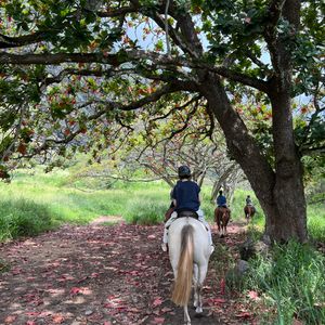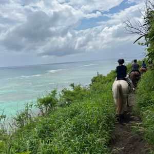 This was my first time participating after visiting Hawaii more than ten times. I had some fear, like the possibility of falling off a horse, but I was completely captivated during the two-hour ride with well-trained horses, even though it was my and my spouse's first experience riding. The experienced female guide provided thorough instructions along the way, and most importantly, there was a Japanese guide named Sanae on-site who kindly explained how to use the lockers and tips in Japanese from the moment we arrived on the shuttle bus, which made us feel at ease. Exploring the great nature of the Kualoa area with the smart horses at a leisurely pace is the best way to enjoy it. You can rely almost entirely on the horses while just holding the reins throughout the entire journey.