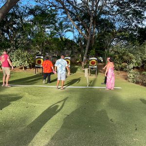 The activities before the show included Hawaiian tattoos (free with tips), stone bowling (free), a spear-throwing game called O'o'i (free), and a paid photo opportunity with tropical birds. After lining up for the Hawaiian tattoo, I managed to try stone bowling and O'o'i once each, just in time. After the experiences, we received shell leis for stone bowling and O'o'i. The paid photo with the tropical birds could be a nice keepsake, but since they were frequently pooping while on my arm, I personally found it a bit much.
