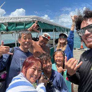 It was great that it was sunny this year after two consecutive years of cloudy weather. When it's sunny, the water is beautiful and I could see the turtles well. Unfortunately, the white sandy beach didn't appear, but I was happy to find Jamie, who took care of us last year, on the neighboring boat! This year, I was moved to see a large turtle, about the size of three adults, swimming gracefully up close! Anyway, the crew members teach us various things in Japanese, so there's nothing to worry about. It gets cold after coming out of the sea, so it's a good idea to wrap yourself in a towel you brought from the hotel. Thank you, Izumi!