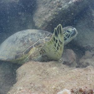 イルカを見たあと、シュノーケリング場所では水深10メートル程のところに海亀も泳いでいるのが見えて嬉しかったです。