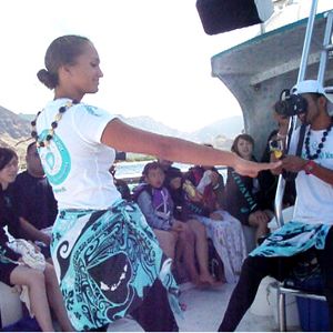 船上で手作りのハンバーガーを貰い、クルーの人たちが踊るフラダンス。