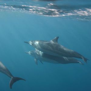 自分のほんの数十センチ下を、赤ちゃんイルカとお母さんイルカのペアが、何組も泳いでいます!しばらく平行して泳ぎました。追いつけなくても彼らは繰り返しやってきて、まるで遊びに来てくれているようでした。ウィンクしながら目の前を横切るイルカさんや、見事なスピンを披露してくれるイルカさんも・・彼らは遊び心いっぱいでした。心から感激しました。