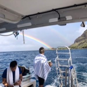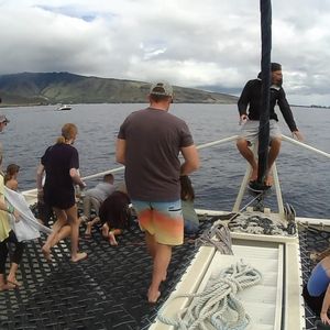 イルカがなかなか現れず、諦めムードのなか船上でクルーの陽気なフラダンスで盛り上がりはじめると、イルカ出現!時間的に一緒には泳げなかったけど、沢山のイルカが船上から見れました。ジャンプしているところも!おばさん3人組でしたが、初カヤック、滑り台、シュノーケリングとてもたのしかったです。1人船酔い心配でしたが送迎バスの中で買った酔い止めブレスレット効果的面!ランチのハンバーガーも美味しく、クルーのみなさんも親切で楽しく最高でした。また、ハワイに行ったら参加したいです。