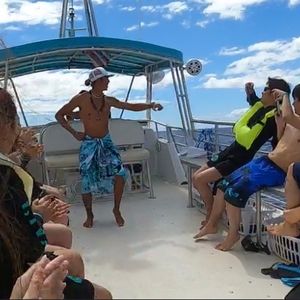 The dolphins were slow to appear, and just as we were starting to feel discouraged, the cheerful hula dance by the crew got everyone excited, and then the dolphins showed up! We couldn't swim with them due to time constraints, but we were able to see many dolphins from the boat, including some jumping! It was a group of three ladies, and we had a great time with our first kayaking, waterslide, and snorkeling experience. One of us was worried about seasickness, but the anti-nausea bracelet we bought on the shuttle bus was very effective! The hamburgers for lunch were delicious, and the crew was kind and fun, making it an amazing experience. I would love to participate again when I go to Hawaii!