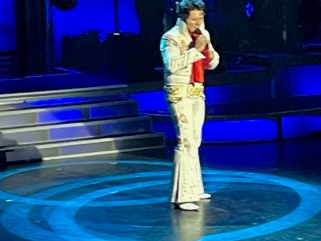 しばらくすると、エルビスプレスリーのそっくりさん、容姿だけでなく衣装も歌声も素晴らしい!舞台横に映し出されたエルビスプレスリーご本人の映像と何ら引けなく、釘付けです。