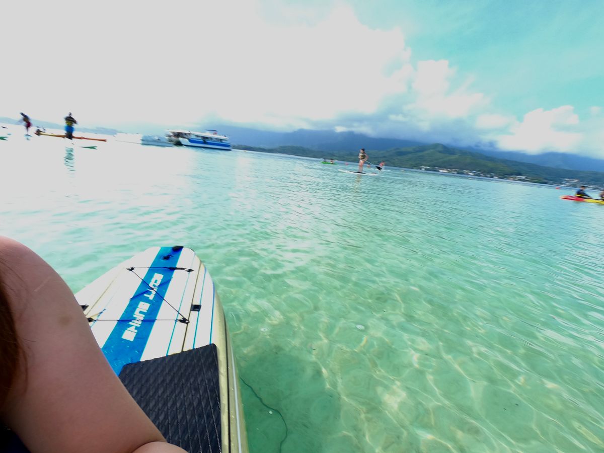 SUPは初めてだったので、プライベートレッスンを申し込みましたが、最初の5〜10分程でパドルの持ち方、ボードの乗り方、立ち方の説明を受け、海へ