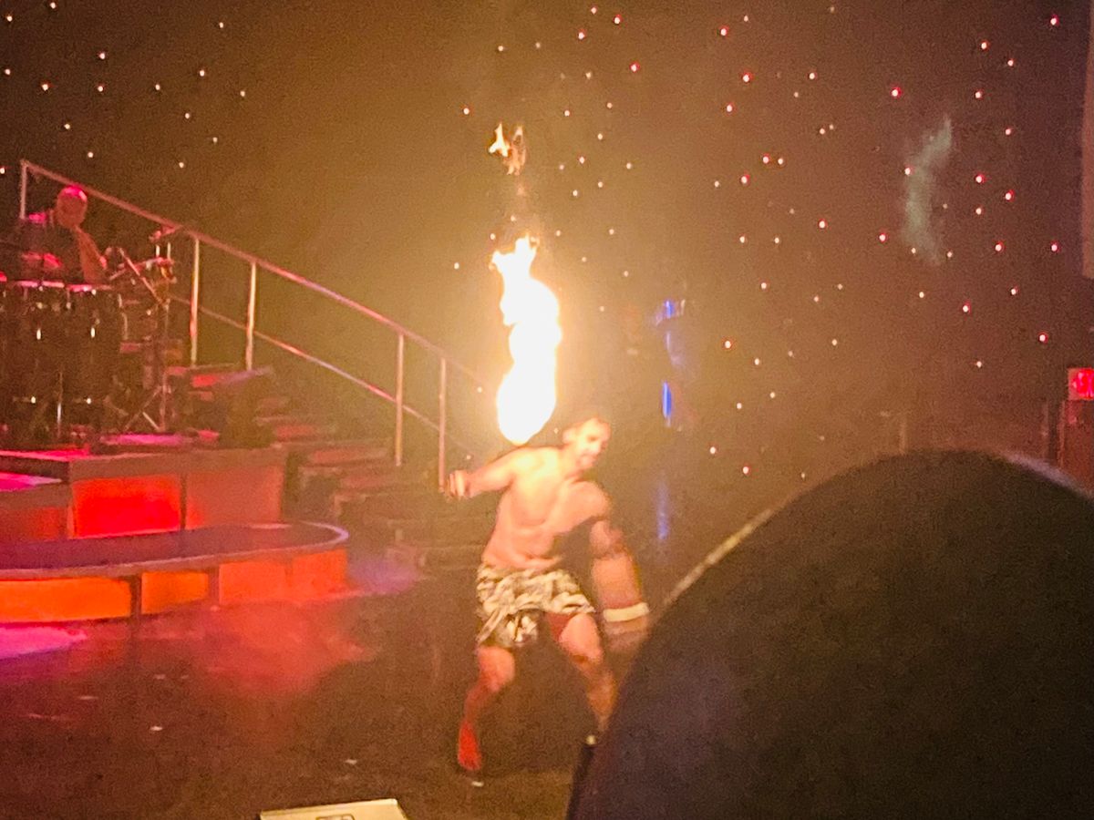 Men swam down from the ceiling, and there were performances featuring Elvis Presley, Michael Jackson, fire dancing, and hula, all packed into one exciting show. Time flew by as the energy continued to build.