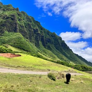At Kualoa Ranch, there are many activities, and at my husband's request, we decided to go horseback riding. This was my husband's third time, while it was my first experience. Although I was nervous, I got to ride a horse and slowly lined up, swaying gently on the calm and smart horses. We enjoyed beautiful views of the mountains, movie filming locations, and the stunning contrast between the sky and the sea. Initially, I was very anxious, but in the end, I was extremely satisfied with choosing horseback riding and participating in this course. I still remember various scenes vividly. It's a place I would love to visit again if I have the chance! Thank you to the guides!