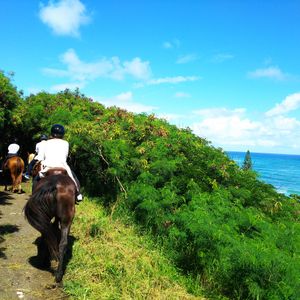 ハワイに行くといろいろな場所で良く乗馬しますが、ここのコースは山の中を乗馬しますが頂上付近からは海が一望でき最高です。