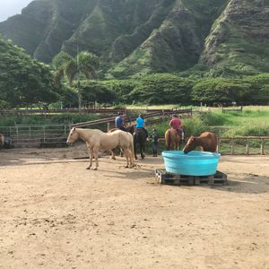 It took about an hour and a half from Waikiki, but it was a very peaceful and relaxing ranch. The horseback riding options for preschoolers are limited, but this plan is very fulfilling. We were able to leisurely stroll through the vast grounds and even had designated photo time at various points. Along the way, we learned a lot about Hawaiian plants, how to care for horses, and how to give commands. At the end, we gave a thank-you carrot, brushed the horse, and took photos, making for a total experience of about 1 hour and 30 minutes. They kindly answered all of my daughter's many questions, and she fell in love with horseback riding. It felt like a personal English lesson while riding, which was a great deal. The entrance to the ranch is a bit tricky, but it was truly a wonderful place. If you have some time to spare, I highly recommend it!