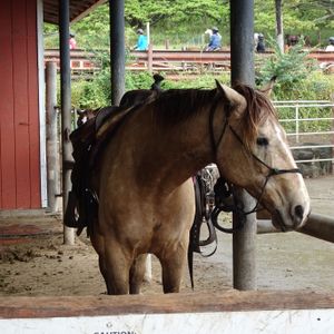 Perhaps because it started to rain, the horse became grumpy and suddenly crouched down. At that moment, one of my legs got pinned underneath. It was my first time riding, and I was really surprised by the suddenness of it, but the staff scolded the horse, and since I wasn't injured, I was able to return safely.