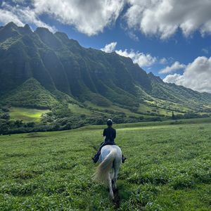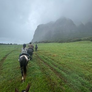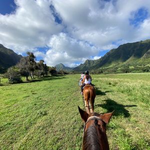 I rode for 2 hours, so my butt and knees hurt afterward, but riding while enjoying the magnificent views of the mountains and the sea was wonderful! There was ample time before and after the ride to take various photos and check out the shop, which was great. We were the only Japanese people there, but when we arrived at Kualoa Ranch, a staff member who spoke Japanese guided us, which was reassuring. The horseback riding video is also available in Japanese, so it's fine even if you don't speak English.