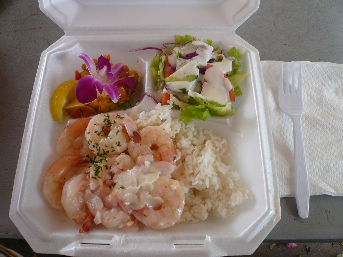 ランチのガーリックシュリンプは、以前行ったときに食べたものとは違い、エビ入り弁当でした。