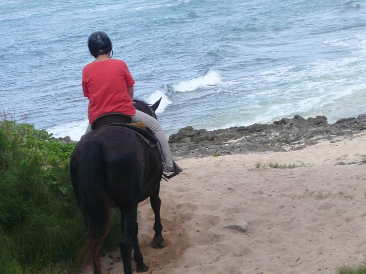 海辺の乗馬は最高でした。ツアー会社のガイドさんが、馬の乗り方を丁寧に教えてくださったので、全くの初体験者でも問題はありませんでした。(反対に牧場の方は、英語なので全然わかりません。ガイドさんの事前レクがなければ、何もわからず乗ることに?) やはり生き物、若い女性は馬になめられて扱いに苦労していました。このツアーにはわずかなハレイワ観光などが含まれていましたが、乗馬だけに特化した方が良いかもわかりません。(他の1日観光と重複するところがあったので)