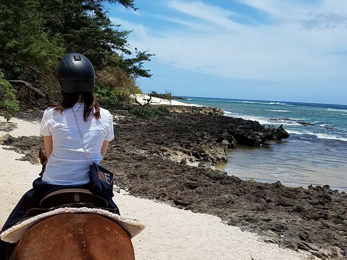 ウミガメは見れませんでした。渓谷は足場が悪くなったことから、海岸ルートの乗馬に変更になりました。1時間程度の乗馬はしっかりと調教された馬で乗りやすかったです。