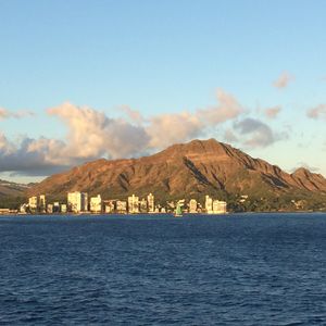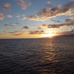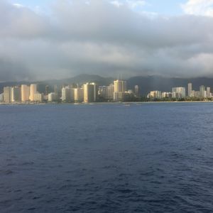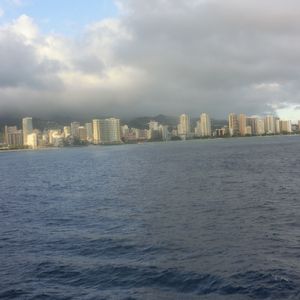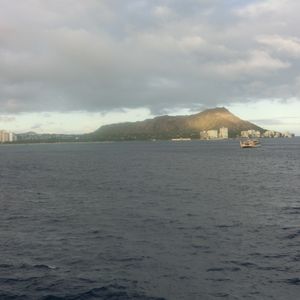 船から見るワイキキビーチ、ダイアモンドヘッド、夕陽はすごくきれいでした。お食事は可もなく不可もなく、という感じでした。最後のケーキが甘すぎず美味しかったです。