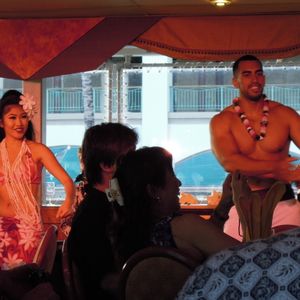 一番下の階でのクルーズでした。他のフロアや部屋では何人かのフラダンスなどのパフォーマンスがありましたが、やはり一番下のランクだからなのかフラなどのパフォーマンスは2人、演奏者は1名でしたので、こじんまりした雰囲気でしたが、1歳半の子供を連れていったので、ちょうどよかったかと思います。