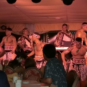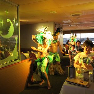 船からの景色は、ワイキキビーチ沿いに並ぶホテルとダイヤモンドヘッドを見るくらいで、まずまずといった感じ。食事もめちゃくちゃ美味しいというわけでもなく、メインのロブスター以外は無難な感じです。スターオブホノルルの最大の特徴は、船内で行われるポリネシアンダンスでしょう。終了時刻の後半になると、多数のダンサーが船内の通路を埋め尽くし、お客の目の前でダンスを繰り広げます。けっこうノリノリになり、一緒に踊る人もいるので、なかなかの盛り上がりでした。最後はヤングマンを歌い、乗客全員列になり踊りました。