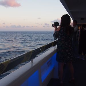 妻とはじめて乗船しました。沖に出ると多少揺れましたが、それにもまして、サンセットと海にのびる光の道、そばを横切るヨットに、妻ともどもうっとり、おまけにショーのあいだにはザトウクジラが潮を吹くなど大感激な経験でした。食事もブッフェスタイルで好きなものを食べることができて、満足のいく内容でした。
