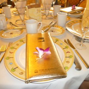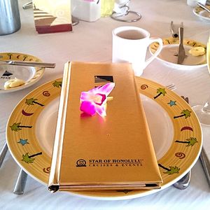 It was my first cruise dinner, so I did not know what to expect. A funny jokes-filled driver picked us up in a luxury motorcoach bus and upon arrival to Aloha Tower, an elegant staff representative escorted us to the ship. The tables were set beautifully with an orchid in the middle of the dinner plate.