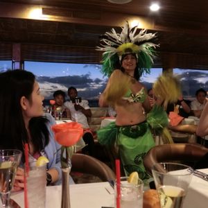 ロブスターまるまる一匹でもお腹がいっぱいなのにステーキが出てびっくり。美味しかったのでペロリとたいらげました。デザートも美味しいかったです。食事が一段落した頃に花火を見て、席の近くでハワイアンダンサーが次々と入れ替わりながらのダンスショー。最後はみんなで一緒に輪になってダンス!一気に盛り上がりが頂点に達したころに ちょうど港に船が戻っていました。食事もショーも素晴らしくて、招待した皆さんが満足してくれました。本当に楽しい夜でした。