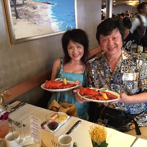 On November 20th (local time), I invited relatives who attended my son's wedding in the morning to express my gratitude. I was surprised to see a whole lobster served, and just when I thought I was full, steak was brought out. It was so delicious that I finished it all. The dessert was also tasty. After we finished our meal, we watched fireworks, and a Hawaiian dancer performed a dance show, with dancers changing in and out near our seats. In the end, everyone joined together in a circle to dance! Just as the excitement reached its peak, a ship returned to the port. Both the meal and the show were wonderful, and all the guests I invited were satisfied. It was truly a fun night.