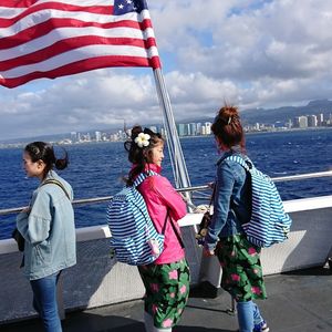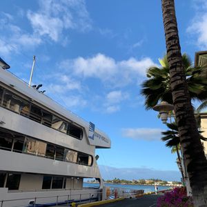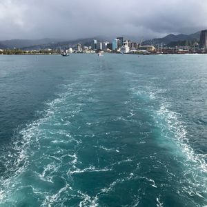 It was a two-hour cruise, and we encountered whales. I was a bit surprised because it was not far out at sea, and we could see the hotels in Waikiki. We saw a mother and baby whale, and the baby seemed to be practicing various things, surfacing and diving repeatedly. The mother whale appeared to be swimming alongside, and it was very heartwarming to watch. It was wonderful! ♬
