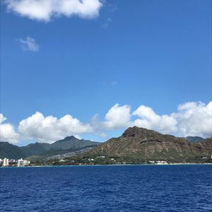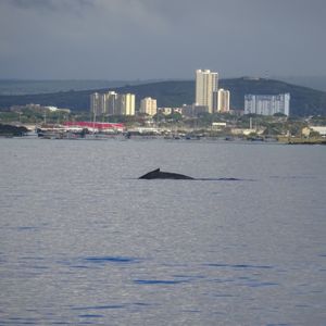 As we cruised off the coast of Waikiki, we spotted about three whales, but we could mostly see just their backs. Just when we were about to give up, we finally witnessed a blow (spouting) scene, which brought us a sense of relief.