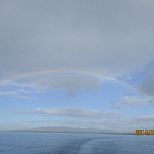 クルーズ後半にやっと小さめの可愛らしい潮吹き(2匹のよう)と、1匹の尾びれだけチラッと見えました。尾びれは見逃した方もいたよう。クルーズ中は、鯨の生体や景色の事を放送し、退屈しないようしてくれてました。小雨後の大きな虹見れたのでとりあえず○
