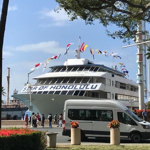 I was picked up by a large bus in front of the hotel and headed to Aloha Tower. It was reassuring to have a Japanese-speaking staff member accompanying us, which made the experience enjoyable. Before boarding, there was a commemorative photo opportunity, and I purchased it for $30 (which included a photo and a commemorative cover with a mount, and they also sent the file to my email). There were other options available for just the photo or just the file.