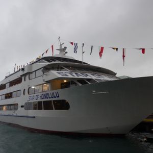 ホテル前で大型バスにピックアップされ、アロハタワーに向かう。日本語のスタッフ同行で安心して楽しめた。乗船前に記念撮影があり、記念に$30(写真と記念の表紙付き台紙、メールアドレスにファイルも送ってもらえた。他にも写真のみやファイルのみの選択肢があった)で購入した。乗船した客より見晴らしの良い広い室内(ちょっとしたパーディー会場の雰囲気)で昼食(ブッフェ)がスタート。食事はカレー・チキン・冷製パスタ・フルーツ4種など。アルコールは別途有料だったが、コーヒー・紅茶はフリー。もう少しメニューが多いと嬉しいが、味は良かった。最上階の屋根付きデッキでクジラを待つ。クジラが発見されるとアナウンスあり。潮吹き後、尾が海へ沈む姿を何回も見ることができた。思っていたより遠くで小さくて一瞬だが、それなりに感動だった。船から眺めるダイヤモンドヘッドや空港から飛び立つ飛行機などの様子も見られて良かった。ハワイ旅行の一番の思い出となった。