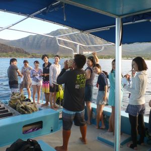 I participated in a dolphin school for the first time on my honeymoon. I thought 5:35 AM might be too early, but surprisingly, it wasn't difficult to wake up. The guide was very energetic, and I had a great time. I learned about the ecology of spinner dolphins, bottlenose dolphins, orcas, and sharks, as well as the differences between mammals and fish, which made me appreciate dolphins even more.