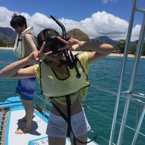 The weather was very nice. We went cruising on a catamaran, and the wind felt really good. After about 30 minutes on board, we arrived at the snorkeling spot and started swimming, where we saw a sea turtle swimming just about a meter away from us. There were also many fish, and the sea was beautiful. There were no other Japanese people besides us...