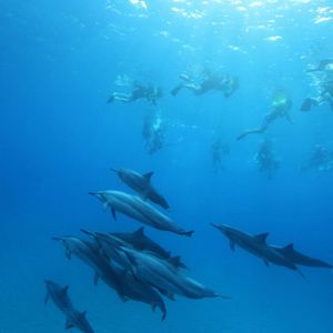 港でボートに乗りいざ出航。私が行った日は、とても運がよく、港を出て10分ほどでイルカの群れに会うことができ、カメも2匹は見ることができました。イルカの群れを見つけたら、先回りして、船長の合図で海に飛び込みます。海はすごくきれいで、底が見えるほどでした。自分たちがいるところのすぐそばをイルカがすいすい泳いでいく様子は、本当にきれいで、目が離せませんでした。また新たなイルカの群れを見つけたら、一緒に潜っているインストラクターが「山のほう」「沖のほう」と指示を出してくれ、そちらに泳ぎます。しばらく泳いだらボートに上がり、また違うポイントで海に入って泳ぎ…を繰り返しました。説明によると、なかなかイルカの群れに会えず、もっと長い時間泳ぐこともあるそうです。体力がない人にはそれは大変だなぁと思いました。すぐ見れてよかった。
