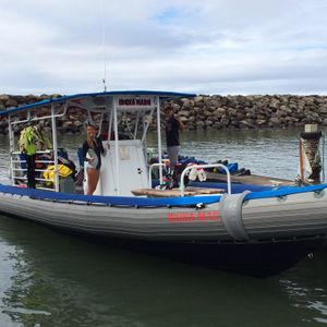 As we quickly boarded the Zodiac and set off to find the dolphins, the rain stopped and the weather cleared up! Near the port, the water was murky and brown, ruining the beauty of Hawaii's ocean. However, about ten minutes later, we spotted a pod of dolphins! They swam right next to the Zodiac. Although the water's clarity was poor and we couldn't see them clearly, we could see the shadows of the dolphins passing by.