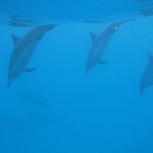 Soon after, more dolphins appeared! We all jumped in again, and with the signal to dive, we saw even more dolphins swimming! I even spotted some smaller dolphins. I learned that baby dolphins can be seen during this season, and they were so small and cute, which moved me once again! Just as I wanted to see more dolphins, it was almost time to leave. As we were about to depart, a large group of dolphins swam right next to our boat! It felt like they had come back to say goodbye to us!!! Everyone was so excited! The guide was also amazed and said she had goosebumps. I was so moved that I almost cried.