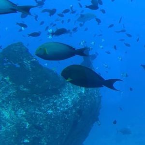 The diving time was 45 minutes, which was sufficient to enjoy the experience. I read on one site that there weren't many fish to see, but during our trip, we were able to see quite a few. If I had to say, the fish didn't appear as colorful as in the advertisements, and overall, it looked quite blue. But that's the true color of the ocean, isn't it? This made me feel like I was really diving.