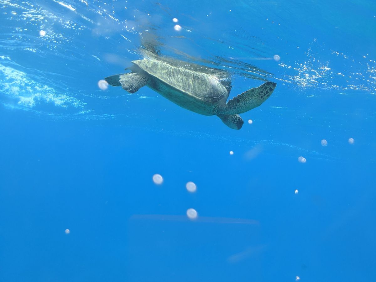 After that, we moved to the underwater scooter spot. Once we switched back to the boat we had arrived on, there were already about 20 people from the underwater scooter group who had almost finished boarding, and we waited about 10 minutes until it was our turn. While waiting, we were able to see a honu (sea turtle) come up to the surface from the boat. The Japanese staff member had told us earlier that we would definitely see honu, so I was excited, but I never expected it to be so easy to spot them! (((o(*゚▽゚*)o)))♡