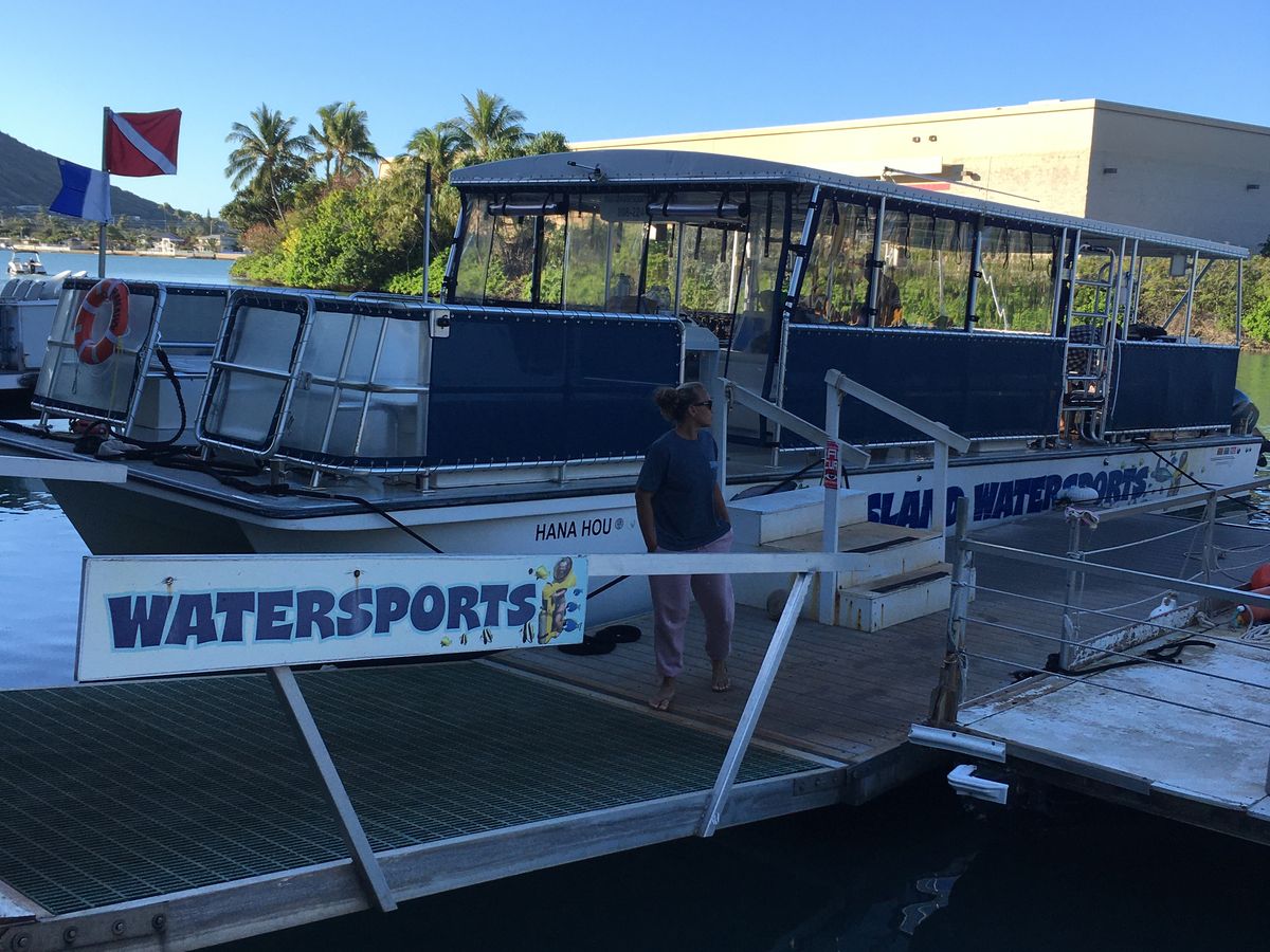 初めてのハワイでしたが天候にも恵まれ、とても快晴でのオプショナルツアーで、初めに船に乗りサンドバーの浅瀬でのシュノーケリングをしました。