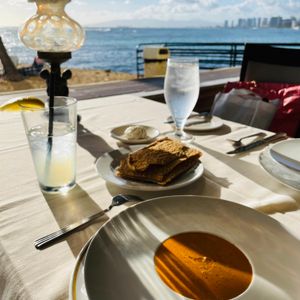 海沿いの席で、夕焼けの風景に感動し、モンクシールの姿に癒やされるなか、前菜からのコースが運ばれて、特にロブスタービスクがおいしかったです。