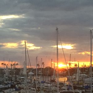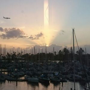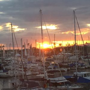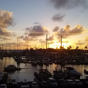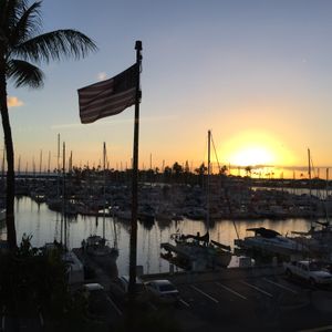 ハワイ到着時は、雨で、時よりどしゃ降りでしたが、ヨットハーバーが見える100Sails Restaurant の