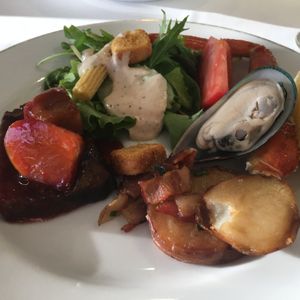 お天気が悪くて夕陽は見れませんでしたが、お店の中の雰囲気はとても良く、スタッフの皆さんも笑顔でサーブしてくれて、とても楽しい時を過ごしました。食事はお肉もお魚もなかなかのボリュームで美味しかったです⭐️