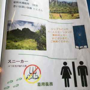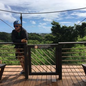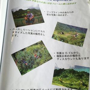 I had wanted to try this for a long time, and this was my first time participating! Our group met at 8:30 AM, and we started at 9. We drove there with a rental car. After arriving, we managed to check the consent form at the check-in monitor, put our wallets in the safe box for valuables, checked our bags at the luggage counter, and took care of the restroom. I hung my phone around my neck because I wanted to take pictures. Then, we were fitted with harnesses for sliding, put on helmets, and waited for the time to start. There were seven participants, including us, all from the mainland United States, along with three staff members. The staff were all friendly and attentive, checking in on us even though we didn't speak English, using gestures and confirming our understanding, which made us feel at ease during the experience! We practiced on a short course first, and then moved on to the next location by jeep. During the ride, they talked about various plants on the farm. We slid down seven courses, changing our positions and eating bananas and tomatoes along the way! It felt amazing! When they asked if it was good in Japanese, I replied, "イイネ!" (Good!). I was worried because I’m a bit overweight and not very fit besides my lack of English, but there was a course where we had to climb with a rope, and even though it was a short distance, I felt exhausted and thought, "I can't do this!" When I called out for help, they laughed and came to assist me! It was so much fun! I bought a T-shirt and a few photos, and received the photos via email by lunchtime! The price was a bit high, but the pictures turned out great! I want to do it again!