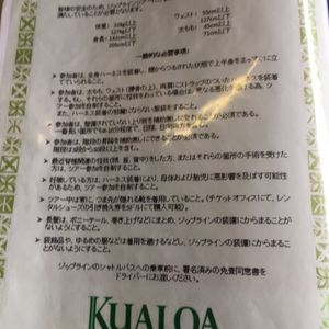 前からやってみたくて、今回初めて参加しました!私達の回は朝の8:30集合で、開始が9時。レンタカーで自分達で行きました。到着してからはチェックインモニターでなんとか同意書のチェックをして、貴重品用のセーフボックスにお財布を入れ、荷物用のカウンターに荷物を預け、トイレも済ませておきます。携帯は写真撮りたくて首からさげました。それから滑る用の綱を付けて貰い、ヘルメットを被り、時間になるのを待ちました。体験者は私達を入れた7人で、全員アメリカ本土の方。それにスタッフさんが3人居ました。スタッフの方は皆気さくで、英語のできない私達にも気を配ってくれて、ジェスチャー入れたり、わかったか確認してくれたり、色々フォローしてくれているのがわかり、安心して体験することが出来ました!最初に短いコースを練習して、そこからジープ?で移動しました。移動中は色々ファームの植物のことを話してくれてました。7本のコースを滑り、体勢を変えたり、バナナやトマトを食べたりしながら進みました!すごく気持ち良かった‼︎GOODの日本語を聞かれたので、イイネ!と、答えました!笑。私は太っちょで英語の他に体力が無いのも不安材料でしたが、途中ロープでよじ登るコースがあり、短い距離ながらもへこたれて、もう無理!と思ってヘルプミー‼︎と言ったら、笑って助けてくれました!とっても楽しく行けました‼︎Tシャツと写真を何枚か購入し、お昼にはメールで写真が届きました!値段ははりますが、いいのが撮れてました!またやりたいです‼︎