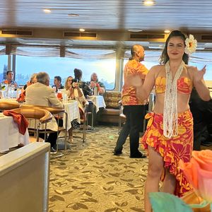 After giving our names, we were shown to our seats and served a delicious welcome drink of champagne! Once we set sail, we enjoyed a toast from the captain and a hula performance by the dancers! We enjoyed our meal for a while, and although we might have been able to see the sunset outside, we couldn't due to the rain. However, we were able to take our time with the meal and enjoy some jazz music in the second half! The ship was a bit rocky, possibly due to the rain and strong winds, so those who are prone to seasickness should be cautious! The restrooms were very spacious and clean!