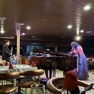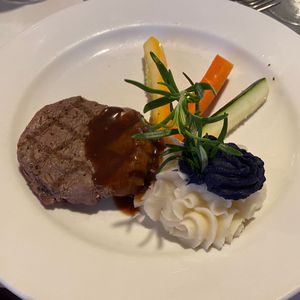 We thoroughly enjoyed the delicious dinner. The steak was exceptionally tender, and the fresh fruit sorbet was our favorite. The servers provided excellent service as well, and the entertainment complemented the rainy weather, creating a more relaxing atmosphere.