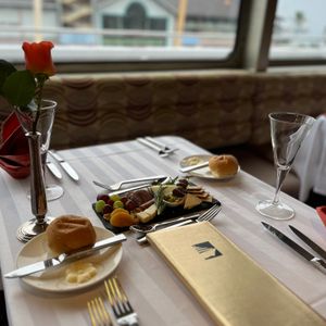 The event began on time with a glass of champagne. I must admit that the food was better than expected. The staff waited to serve each course until we were at the table, as we often went out to take air between courses and take pictures. Would recommend to anyone looking for a short dinner cruise with romantic/relaxing ambiance.