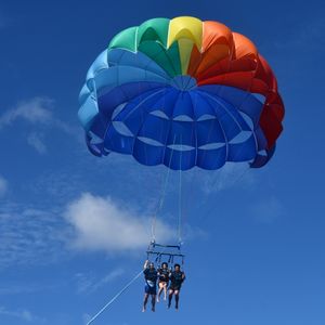 初パラセイル。全く英語が分からない親子で参加。受付のスタッフさんは少し日本が分かる方でしたが、ボートのスタッフさん2名は英語のみ。私たちを含めて5組(2組は外国人、3組は日本人)で出発。スタッフさんの決めた順番で1組ずつ飛びました。途中、お一人の方が船酔いで海に◯いていたので、乗り物酔いされる方は対策が必要かと思います。パラセイルする際は、サングラスと首からスマホをかけたままでOKでした(自己責任で)。降りる時は足が膝くらいまで水に着いたタイミングでもう一度少し飛ばして(浮かせて)くれて、最終的にはボートの上に降ろしてもらえたのでほとんど水にぬれませんでした。スタッフさんの話(英語)は全く分かりませんでしたが、楽しい雰囲気は伝わってきましたし、実際にとても楽しめました!受付から解散まで約1時間半で、ヒルトンの近くという場所を考えると気軽に体験できるアクティビティだと思います。